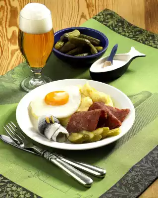 Season with a little salt. Cut the cucumbers into slices. Arrange rollmops, cucumber, corned beef, puree and eggs on plates.