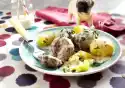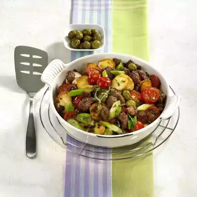 Add spring onions and thyme and fry for 2-3 minutes. Add tomatoes, add 150 ml water, bring to the boil. Stir in broth and simmer for 2-3 minutes. Fold in potatoes and olives and season with salt and cayenne pepper.