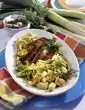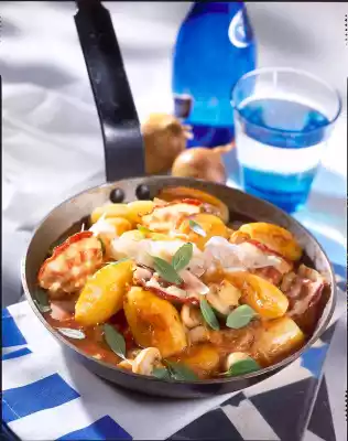 Stir in tomato paste. Deglaze with stock, bring to the boil and stir in soup powder. Cook at medium heat for another 10 minutes. Fold in sage. Add bacon again. Serve sprinkled with parmesan