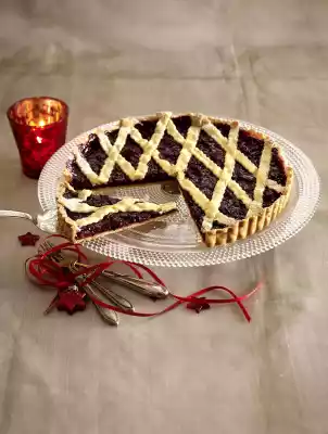 Roll out 75 g of dough between 2 layers of baking paper in a rectangular shape (approx. 7 x 26 cm). Cut lengthwise strips (approx. 1 cm wide) with a wavy dough wheel, place 5 strips on the tart at a distance of approx. 4 cm and cut to the right length. Place the remaining strips on top so that rhombs appear. Knead the remaining dough and roll out again between 2 layers of baking paper in a rectangular shape (approx. 3 x 26 cm). Cut 3 strips in the same way and lay them on top. Bake in the preheated oven (electric cooker: 175 °C/ convection oven: 150 °C/ gas: level 2) for 35-40 minutes, remove from oven and let cool down for about 1 hour. Serve dusted with icing sugar. Cinnamon cream tastes good with it