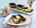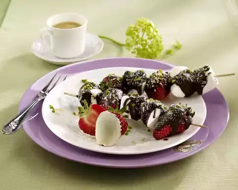 Place the cake rack on baking paper. Pour dark chocolate over the skewers and sprinkle with pistachios and grated coconut. Put the skewers in a cool place until the chocolate is firm. Cut strawberries covered with white chocolate in half and arrange on plates with 2 skewers on each. Dust with icing sugar