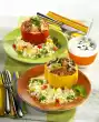 Put rice in boiling salted water and cook for about 15 minutes. Drain rice on a sieve. Wash the chicken meat, dab dry and cut into pieces. Clean and wash spring onions and cut into rings.