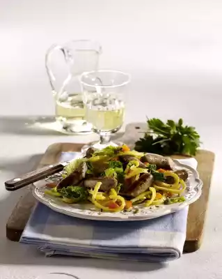 Add stock, bring to the boil and stir in the spaetzle. Simmer for another 3-4 minutes. Season to taste with salt and pepper. In the meantime heat 1 tablespoon of oil in a pan. Fry the sausages for about 5 minutes.