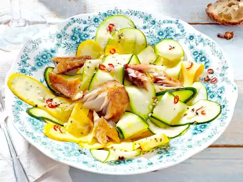 Clean, wash and dry zucchini and slice lengthwise into thin strips. Mix the courgettes carefully with the vinaigrette and arrange on plates. Pluck the mackerel fillets into pieces and spread on the salad. Ciabatta tastes good with it.