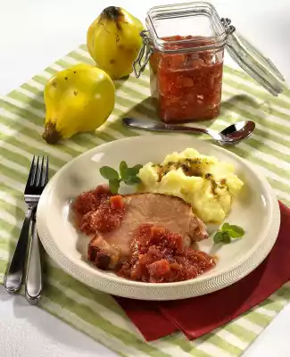 Fry the cured pork loin in hot oil for 3-4 minutes on each side. Season with pepper and a little salt. Arrange the pork loin and some chutney, garnish. Serve with mashed potatoes and melted marjoram butter