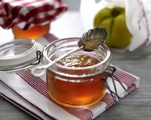 Wash quinces thoroughly and cut them into small pieces (including the core). Put quinces and 3 litres of water in a pot. Cover and simmer for about 1 hour. Put the quinces on two large sieves, each with a moistened gauze cloth and let them drain overnight. Measure out 2700 ml of juice.
