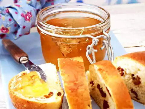 Pour jelly immediately into prepared glasses. Seal tightly. Place on the lid for about 5 minutes. Turn over and let cool off. Tastes great with raisin rolls.