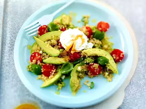 Halve the avocados, remove the seeds and peel the flesh. Cut avocados into slices. Mix quinoa, cherry tomatoes, avocado, spring onions and vinaigrette. Put the salad on plates, decorate with basil and place one egg on each.