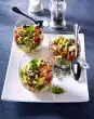 Mix 6 tablespoons vinegar and lime juice, season with salt and pepper. Fold in the oil. Heat 1 litre of water with 50 ml vinegar and 1 tbsp. salt in a saucepan. Beat the eggs individually in 4 cups. With a whisk create a whirl in the boiling water.