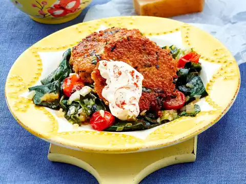 Add remaining onions and garlic and fry until transparent. Add chard and fry for 3-4 minutes, turning. Season to taste with salt, pepper and nutmeg. Carefully mix in the tomatoes. Arrange vegetables and meatballs on plates, garnish with a spot of sour cream.