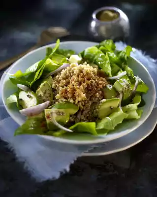 Mix 2 tablespoons lemon juice, salt, pepper and 1 pinch of sugar. Fold in 2 tablespoons of oil. Mix the salad, avocado and shallots with the vinaigrette and serve. Season the quinoa to taste again and add to the vinaigrette.