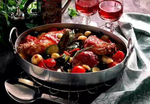 Cook over a high heat for 5 minutes. Add rabbit parts again. Wash tomatoes and zucchini, cut into pieces. Mix in tomatoes and olives. Put the closed roaster into the preheated oven (electric cooker: 200 °C/ gas: level 3) and braise for 1 hour.