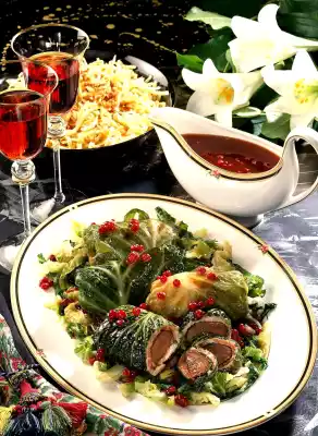 Stir the starch and a little water until smooth, stir into the stewing liquid, bring to the boil again briefly. Add cranberries and season the sauce with salt and pepper. Arrange drained savoy cabbage strips, rolls and some sauce on a plate.