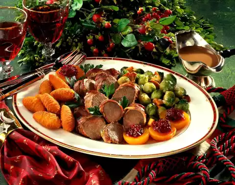 Stir in the sauce thickener, bring to the boil again. Season to taste with salt and pepper. Drain the apricots and fill with cranberries. Cut open the hare fillets and arrange them on a plate with the Brussels sprouts, apricot halves and croquettes.