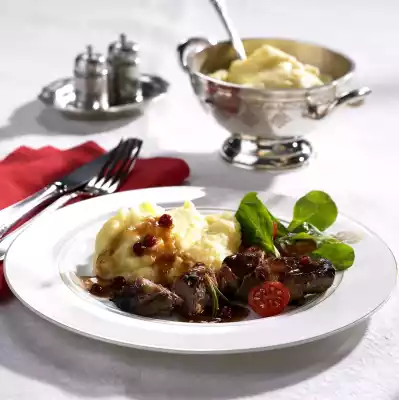 Drain the potato-celery mixture and let it steam off briefly. Heat the milk and fat, finely mash the potato mixture and add the milk and fat mixture. Season to taste with salt and nutmeg. Add cranberries to the sauce, season with salt and pepper.