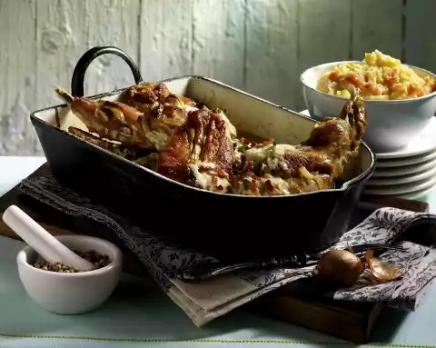Season everything with salt and pepper. Deglaze with white wine and 350 ml water, bring to the boil and stir in broth. Cover and cook in a preheated oven (electric cooker: 200 °C/ convection oven: 175 °C/ gas: level 3) for about 1 1/4 hours. Peel, wash and chop the potatoes and carrots. Cook in boiling salted water for about 20 minutes. Heat milk and butter. Remove rabbit parts from the oven and keep warm. Puree the stew with vegetables and cream, season with salt and pepper. Add the rabbit and bacon to the sauce. Drain the potato mixture and let it evaporate briefly. Mash with milk-butter mixture to a puree. Season to taste with salt and nutmeg.