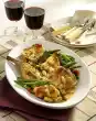 Wash the rabbit and divide into 8 portions. Peel and finely chop the onions. Clean, wash and peel the soup greens and cut into pieces. Heat oil in a roaster, leave bacon in it until crispy, take it out. Fry rabbit pieces in hot bacon fat all around. Add onions and soup vegetables, fry briefly.