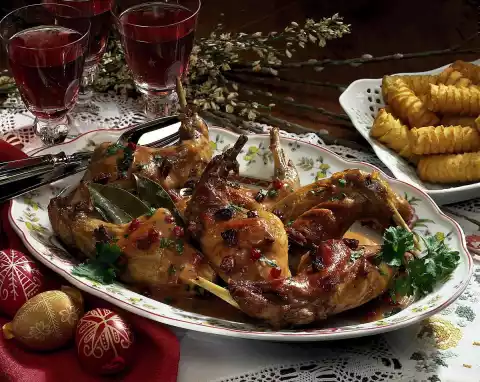 Season to taste with cranberry jam, salt and pepper. Arrange rabbit with sauce on a plate. Wash the parsley, dab dry and chop. Sprinkle over the rabbit. Add croquettes extra.