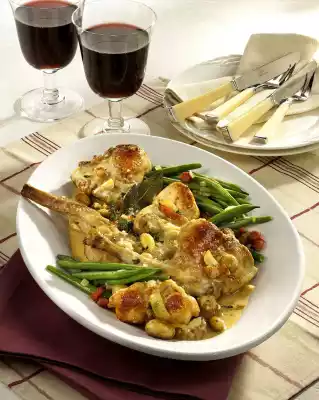 Season with salt and pepper, cover and cook over a mild heat for about 15 minutes. Mix starch with cream until smooth. Stir into the boiling braising liquid of the rabbit. Let simmer for about 1 minute. Season to taste with salt and pepper. Serve beans with the rabbit. Garnish with thyme