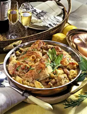Sauté shallots and mushrooms in the frying fat, season to taste. Sprinkle with flour and sweat briefly. Deglaze with sherry, milk and about 3/4 l water. Add rabbit, herbs and bay leaf, bring to the boil. Braise open in a hot oven (electric cooker: 200 °C/recirculating air: 175 °C/gas: level 3) for approx. 45 minutes