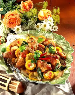 Clean the corn on the cob. Cook in water covered with sugar for about 20 minutes. Drain and cut into slices. Clean and wash spring onions and cut them into pieces. Wash, seed and chop the chilli. Add everything to the meat after about 45 minutes and continue to braise