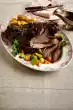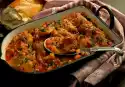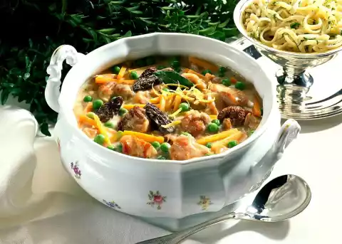 Add wine, stock and morels with soaking water. Cover and let it stew for about 1 hour. Peel, wash and cut carrots into sticks. Add carrots 15 minutes and peas 10 minutes before the end of cooking time to the meat.