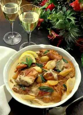 Season to taste with pepper, lemon juice and possibly some salt. Put the rabbit parts back into the sauce and let them simmer for a few minutes. Then arrange in a bowl and garnish with lemon slices and sage.