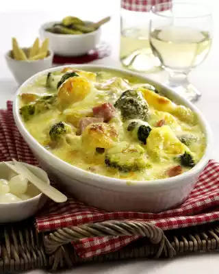 Mix potatoes, broccoli and smoked pork. Pour into an ovenproof casserole dish, pour the sauce evenly over it. Cover with cheese. Bake in a preheated oven (electric cooker: 175 °C/ convection oven: 150 °C/ gas: level 2) for approx. 30 minutes. Remove from the oven and serve. Serve with silver onion, gherkins and corn on the cob