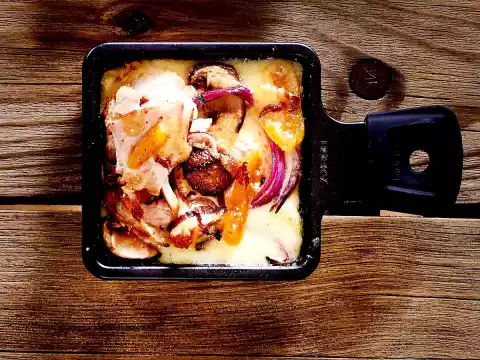 For the raclette: cut 250 g of camembert into slices and place in eight pans. Spread meat salad on top. Fry in the raclette machine until the cheese has melted.