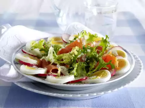 Pluck the salmon into bite-sized pieces. Rinse eggs with cold water, peel and slice with an egg slicer. Arrange eggs, radishes, salad and salmon on plates. Drizzle with tartar sauce.