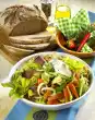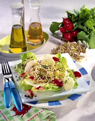Clean, wash and shake the salad dry and pluck into bite-sized pieces. Clean, wash and quarter the radishes. Peel the radish and cut or slice into thin slices. Sort the sprouts, rinse