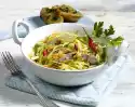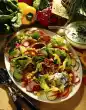 Peel and halve the eggs. Mix prepared salad ingredients and marinade loosely, arrange with the eggs. Sprinkle the rest of the parsley over it