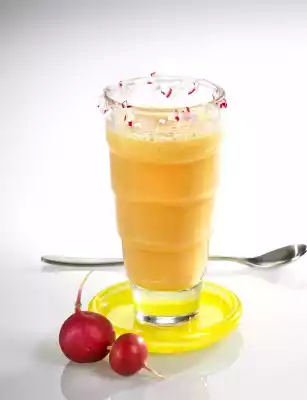 Peel and wash the carrots, celery and radish. Cut the vegetables into slightly smaller pieces and squeeze them with a juicer. Season to taste with salt and pepper. Clean and wash the radishes, dice them very finely. Dip the edge of the glass first in egg white, then in diced radishes. Pour the juice and serve