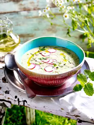 Puree the soup, stir in the cream, heat up and season with salt and pepper. Cut the remaining radishes into thin slices. Serve the soup and sprinkle with radish slices and mint. Sprinkle with oil.