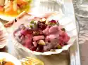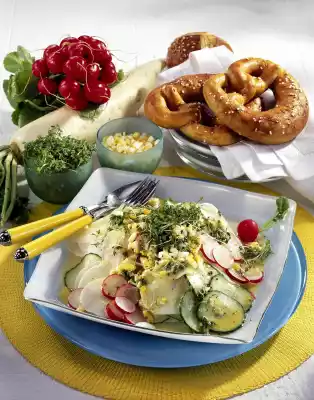 Pour vinaigrette over it. Arrange salad on 4 plates. Spread the cress evenly over the salad and serve garnished with radishes as desired. Pretzels or pretzel rolls are delicious with it.