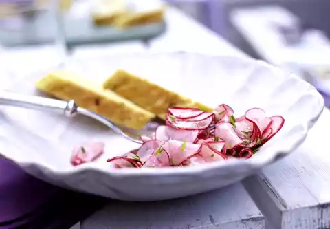 Squeeze the lemon. Mix lemon juice, salt and pepper, stir in oil. Clean and wash the radishes and cut them into very fine slices (or carefully plane them). Wash chives, shake dry and cut into fine rolls.