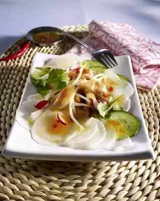 Mix vinegar, chilli sauce, salt, pepper and 1-2 teaspoons of sugar. Fold in 3 tablespoons of oil. Season to taste. Mix with all prepared ingredients. Wash coriander and shake dry. Pluck off the leaves and sprinkle the salad