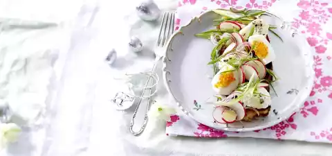 Season mascarpone with salt and pepper. Quarter the eggs. Arrange bread halves on plates. Cut off the mascarpone cream with 2 small spoons of dumplings. Spread 3 dumplings on each half of the bread.