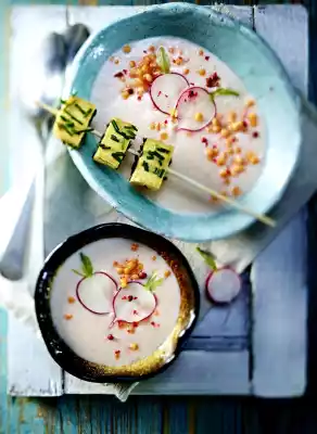 Clean and wash the radishes and, except for one for garnishing, cut them into large pieces. Peel, wash and cut the potatoes into small pieces. Peel and chop the onion. Heat 1 tablespoon of oil in a pot, fry onion until translucent, add radishes and potatoes. Deglaze with broth and simmer covered for about 20 minutes