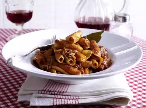 Season the ragout with salt and possibly pepper. Drain the pasta and fold into the ragout. Arrange the ragout in preheated plates.
