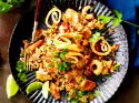 For the sauce, peel the garlic and chop it coarsely. Clean the chilli, cut lengthwise, remove seeds, wash and chop finely. Puree both with sugar, lime juice, fish sauce and 80 ml oil with a hand blender.