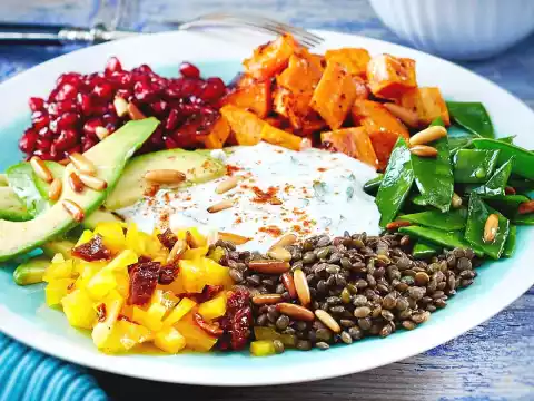 manufacturer) bake for about 25 minutes. Cook lentils in boiling water according to package instructions. Wash, clean and blanch the mangetouts in boiling salted water for about 1 minute. Quench cold and drain.