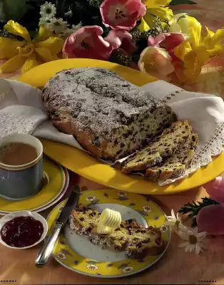 Wash and drain the raisins and currants. Put the fat in flakes, 25 g sugar, salt, cardamom and lemon peel on the flour rim. Knead everything well. Knead in almonds, candied lemon peel, raisins and currants. Let the dough rise for another 30 minutes