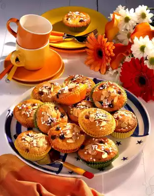 Cool down on a cake rack. Roast the flaked almonds in a pan without fat until golden brown. Remove from the pan and let cool off. Heat up the jam, pass through a sieve and spread on the muffins. Sprinkle with almonds and sugar crystals. Results in about 16 pieces