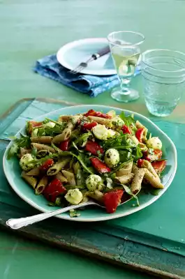 Drain the mozzarella balls well in a sieve. Clean 1 bunch of rocket, wash and shake dry. Mix the pasta, peppers, mozzarella and rocket in a large bowl. Mix with 4-5 tablespoons pesto.