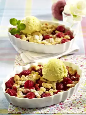Select the raspberries, rinse and drain well. Distribute into the moulds. Sweeten with 2-3 tablespoons of sugar. Spread crumbles on the raspberries.