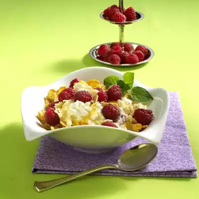 Select the raspberries, rinse and drain. Put the cornflakes in a bowl. Add the raspberries, except for a few for decoration, to the cottage cheese and pour over the cornflakes. Decorate with raspberries and mint. Drizzle maple syrup over them. Sprinkle with hazelnut leaves