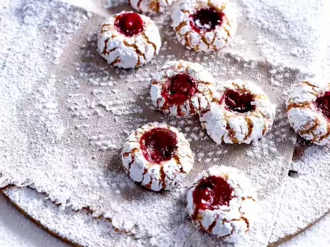 Line two baking trays with baking paper. Shape the dough into about 50 balls the size of a cherry. Roll in icing sugar. Place them on the baking trays with a little distance between them (they run a little bit apart during baking).