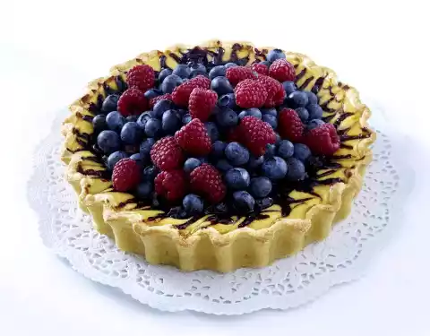 Bake in the preheated oven (electric range: 175 °C/ convection oven: 150 °C/ gas: level 2) for 50-60 minutes on the bottom rack. Sort the raspberries. Remove the cake from the oven, place on a cake rack and allow to cool. Remove from the tin. Mix 100 g blueberries and raspberries, spread over the cake from the middle