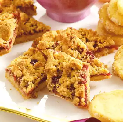 Press 2/3 of the crumble onto the tray as a base. Spread with jam. Sprinkle the rest of the crumbles on top. Bake in the preheated oven (electric oven: 175°C/circulating air: 150°C/gas: level 2) on the lowest rack (gas: see oven manufacturer) for approx. 40 minutes